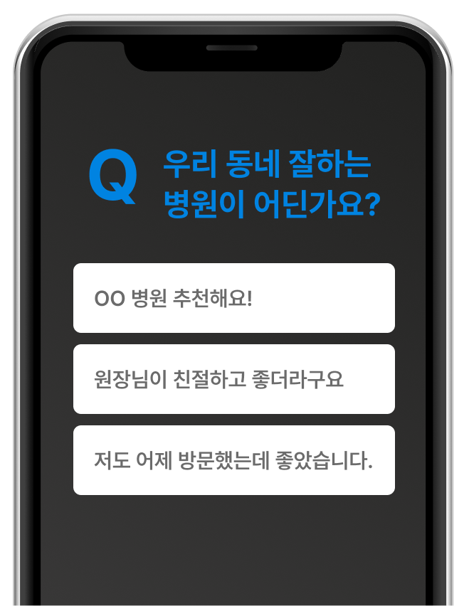 환자가 신뢰하는 ‘진짜 후기'환자는 광고보다 다른 사람의 경험을 더 신뢰합니다.환자에게 우리 병원을 자연스럽게 소개해보세요.