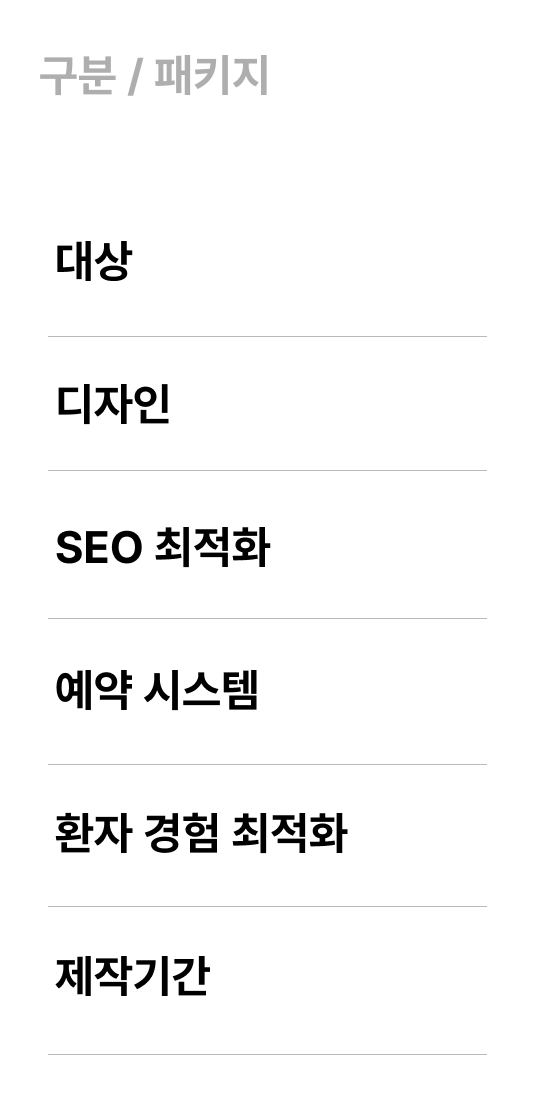 - 병원 브랜드 아이덴티티(BI) 컨설팅 - 규모에 적합한 환자중심의 UI/UX - 고급형 SEO & 키워드 마케팅 전략 구축 | - 병원 유튜브, 영상 콘텐츠 연동 & 페이지 최적화 - 환자 커뮤니티 & 후기 페이지 - 병원 CRM 설계 |